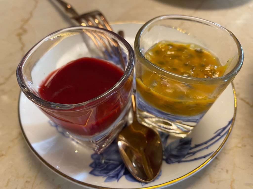 不過下一口搭配覆盆子及百香果醬時,這個組合很可以,不會很哈囉~