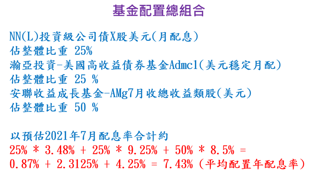 目前整體配置仍偏向看好股市模式,同時間也兼顧風險角度,雖然整體市場仍偏向過度通膨,市場資金未來資金緊縮角度,但另一方面也看好景氣未來的復甦程度以及政府極力擴大基礎建設加速景氣復甦態度及可用工具,相信不至於短時間內快速緊縮資金,不過後續仍會緊盯著可能爆發的停滯性通膨率,再隨機調整產品組合~以上分享~20210728