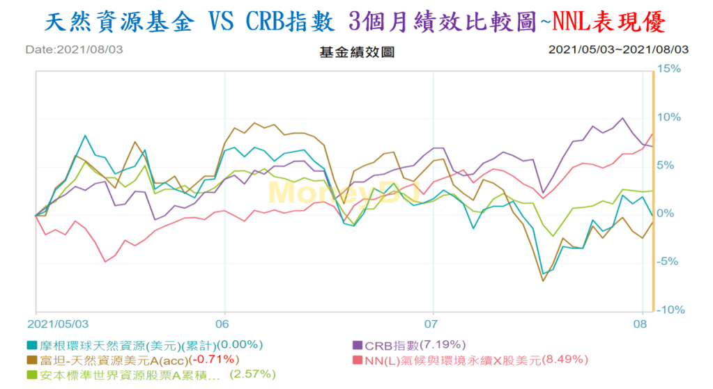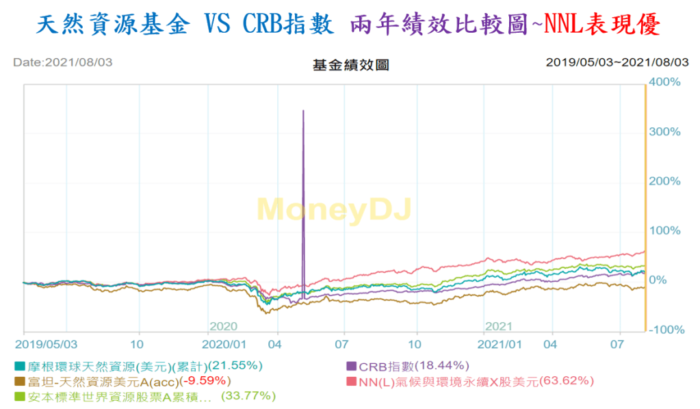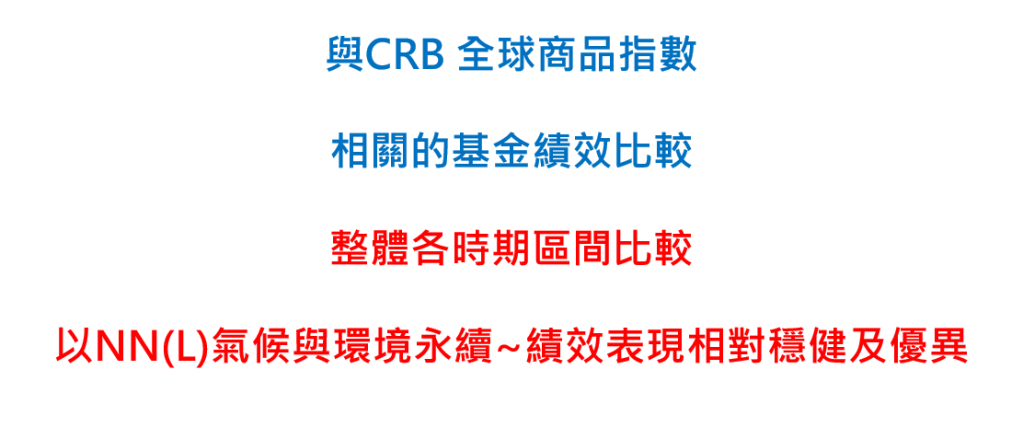 但是以兩年期走勢~卻發現NN(L) 氣候與環境永續基金,表現遠優於CRB指數,也遠遠將其他相關基金拋在遠邊~