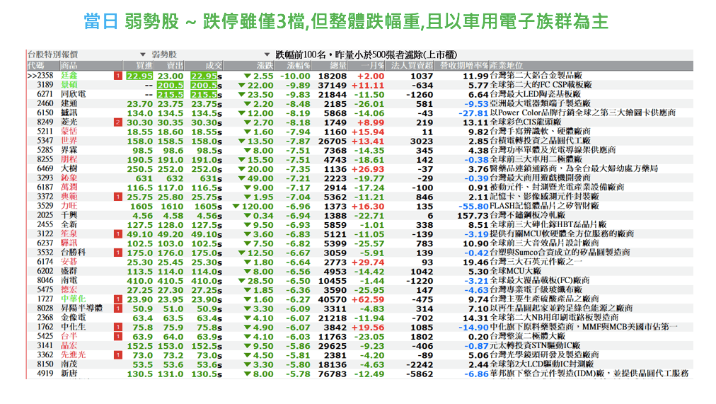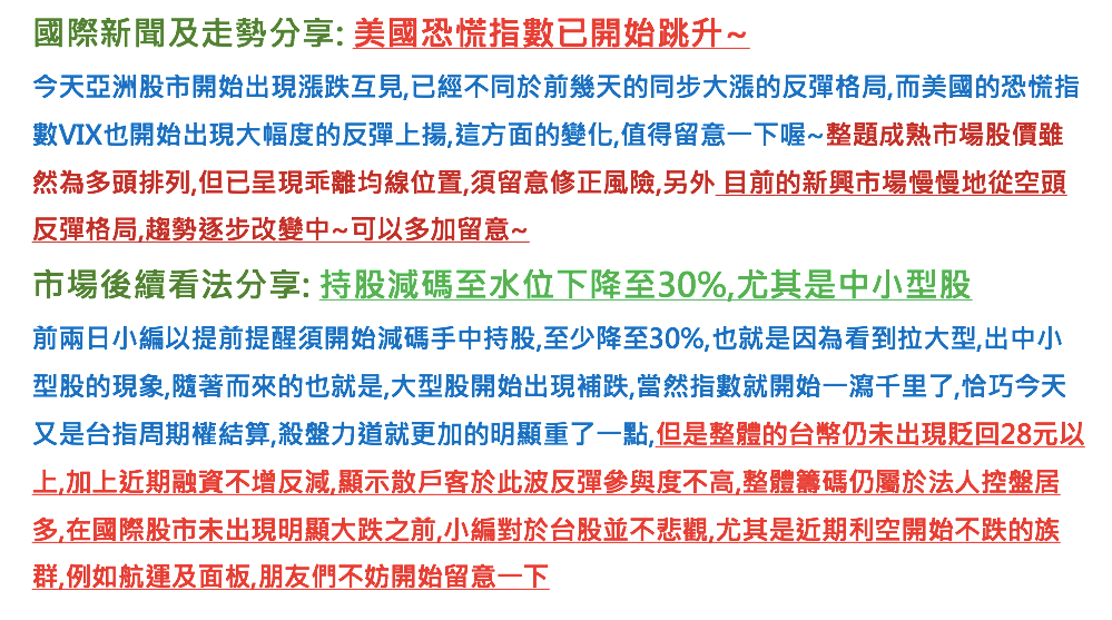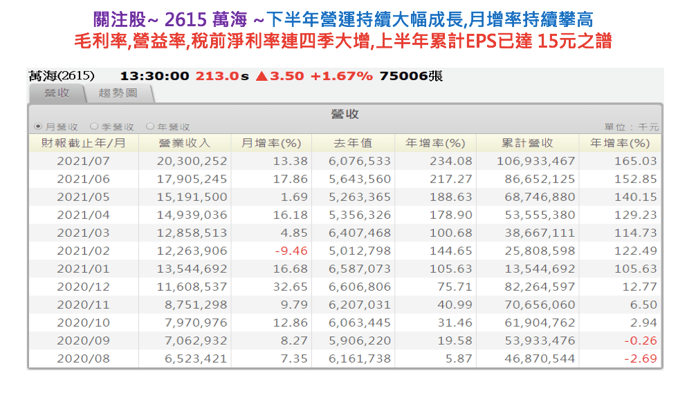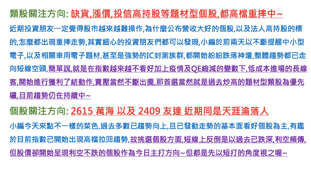 ~早安台股~20210908~關注股~~2615萬海~~2409友達 分類:股盈Good IN2021 /年 9 /月 8 /日發表於賺錢去,早安台股標籤:策略,航運,萬海,台股,台股策略,投資,早安台股 主要是希望與朋友們分享並期待討論互動並無特定推薦任何個股用意請任何的標的買賣及進出場仍依照自己的風險喜好為主最後預祝好友們都牛年大發 一起幸福人生~~ 分享此文: 按一下即可分享至 X(在新視窗中開啟) X 按一下以分享至 Facebook(在新視窗中開啟) Facebook 喜歡 正在載入... 相關 發表者:股盈Good IN 從小即喜愛投資理財的小馬~~一路走來坎坎坷坷~~漸漸地邊摸索邊跌倒的走向了康莊大道 檢視更多文章