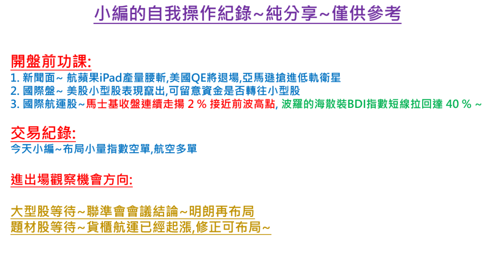 ~~晚上好~台股~2021/11/3 ~ 策略: 指數仍需等待聯準會方向,個股族群表現已經開始轉向 分類:股盈Good IN2021 /年 11 /月 3 /日發表於早安台股 分享此文: 按一下即可分享至 X(在新視窗中開啟) X 按一下以分享至 Facebook(在新視窗中開啟) Facebook 喜歡 正在載入... 相關 發表者:股盈Good IN 從小即喜愛投資理財的小馬~~一路走來坎坎坷坷~~漸漸地邊摸索邊跌倒的走向了康莊大道 檢視更多文章