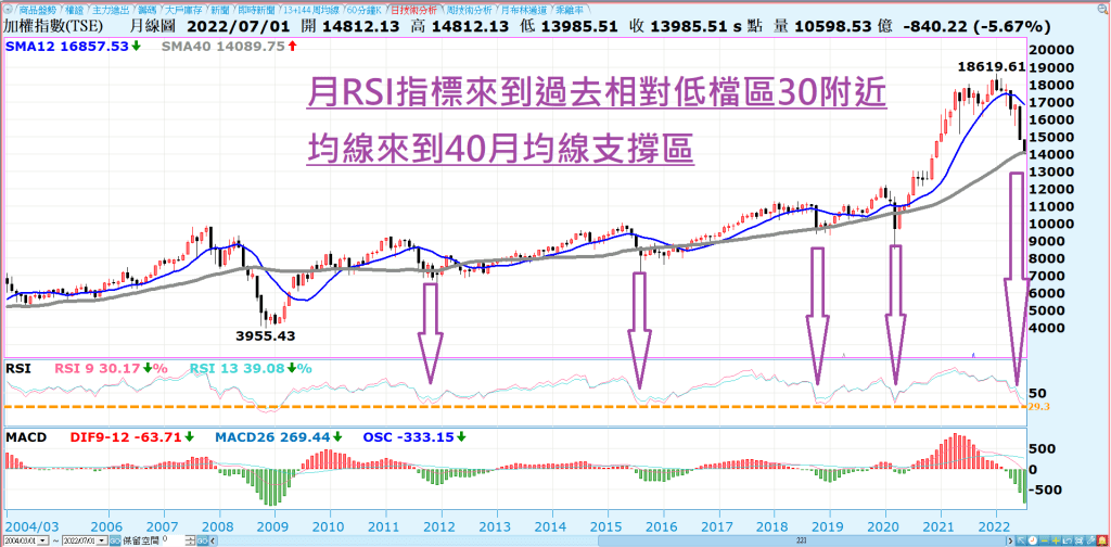 月線圖方面:則是從高檔向下的半途,來到40月均線過去慣性支撐位置