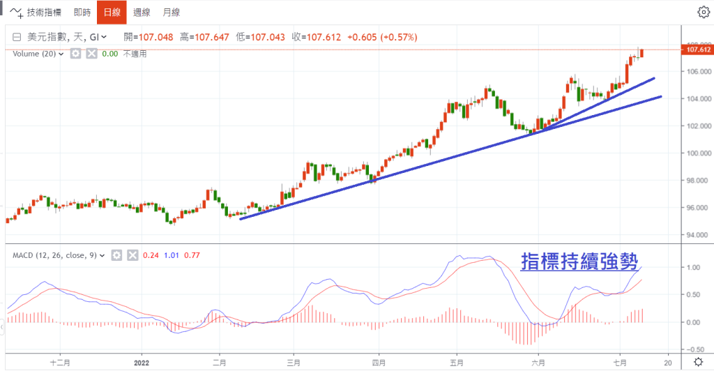 另外美元指數再度回升至107.4,接近前波高點